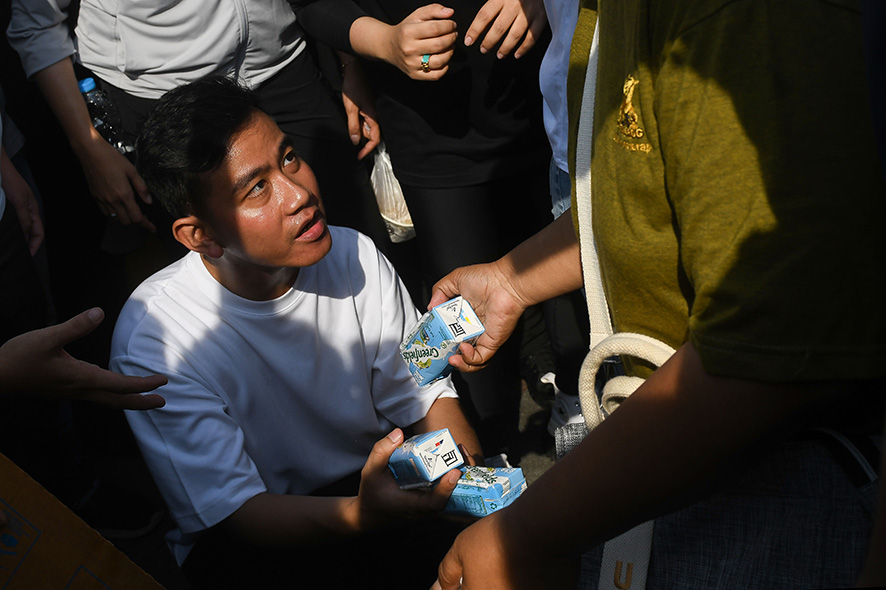 ジョコウィ大統領が3日、西ジャワ州バンドン市内にあるブラガ通りのレストランで、インドネシア連帯党(PSI)党首に就いた大統領の次男、カエサン・パンガレップ氏を.....