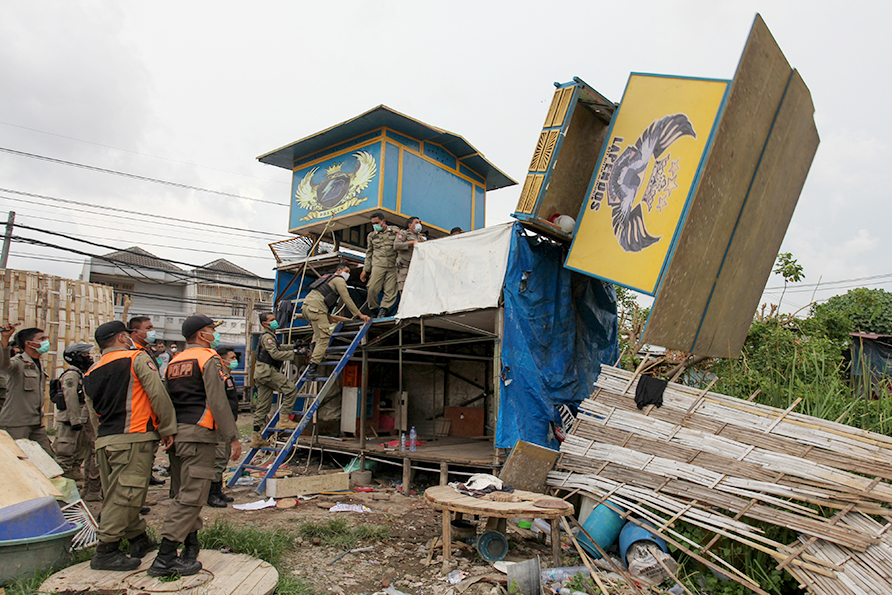 ジャカルタ特別州政府庁舎前で28日、抗議の声を上げる北ジャカルタ・マルンダ地区の公営住宅の住人たち。近隣の石炭ヤードで積み降ろしの際に巻き上がる粉塵による大気.....