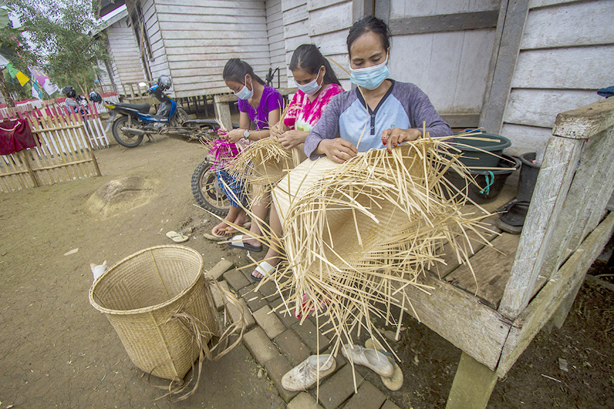 東カリマンタン州サマリンダ・スベラング県で8日、伝統の手織り布を完成させる職人。モチーフに応じて20万~50万ルピアで販売される。(アンタラ) .....