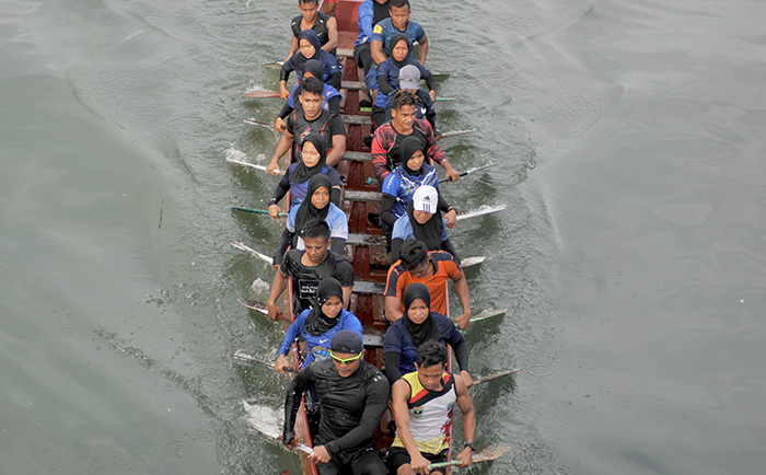 13日、西スマトラ州パダン市で開催された舞踊フェスティバルで、伝統舞踊のピリアン・マンバロを披露する地元の若者たち。(アンタラ) .....