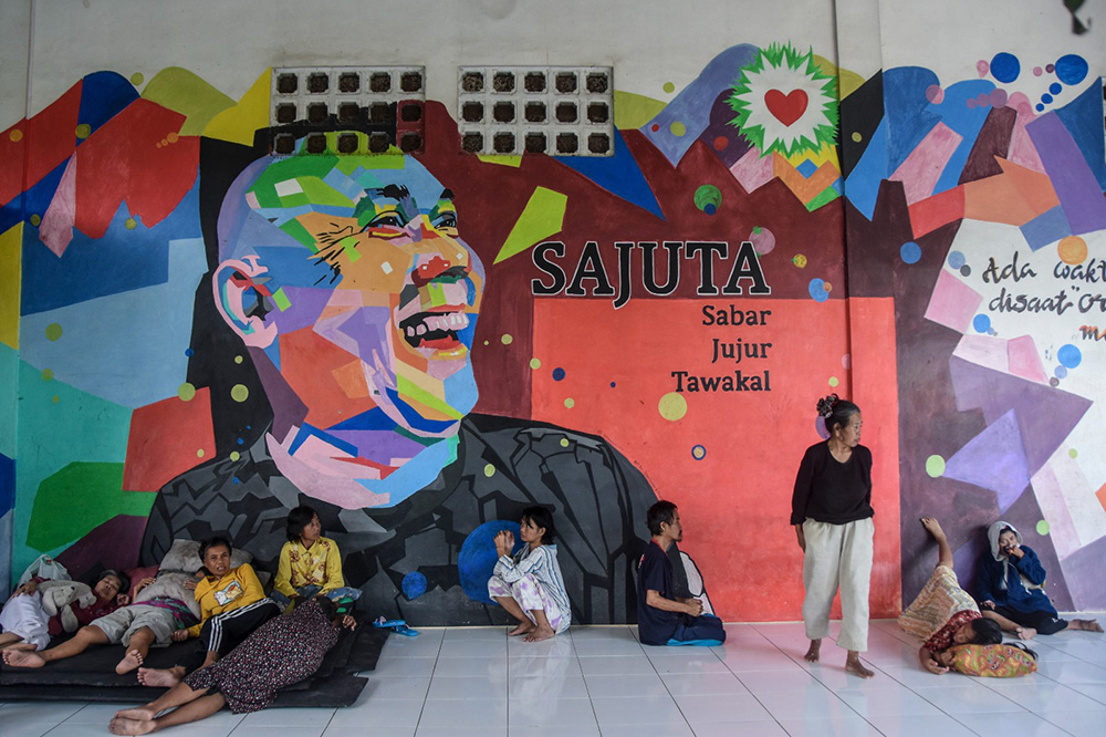 中部ジャワ州バタン県で23日、防災訓練に参加する中学生。県内では7日に地震が発生しており、防災訓練を実施した。(アンタラ).....
