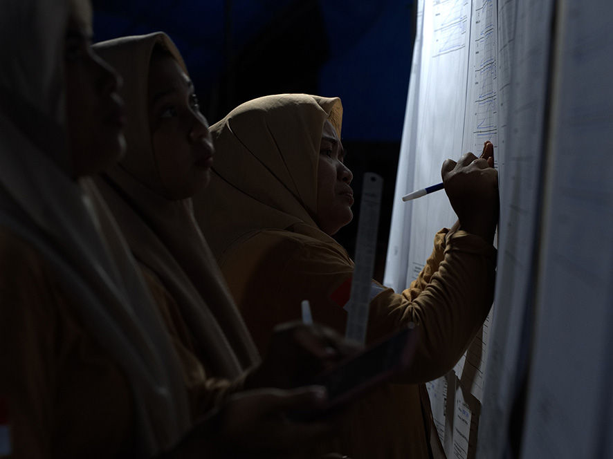 アチェ州バンダアチェ市で25日、伝統的な木造漁船を造船する作業員。漁船1隻には、高いもので数十億ルピアのコストがかかり、進水まで8カ月〜1年かかるという。 .....