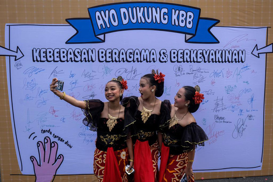 バンテン州タンゲラン市で7日、コーランのオブジェ前で写真を撮る市民。同市政府はムハンマド生誕祭を記念し、市内のモスクにコーランの巨大オブジェを贈った。(アンタ.....