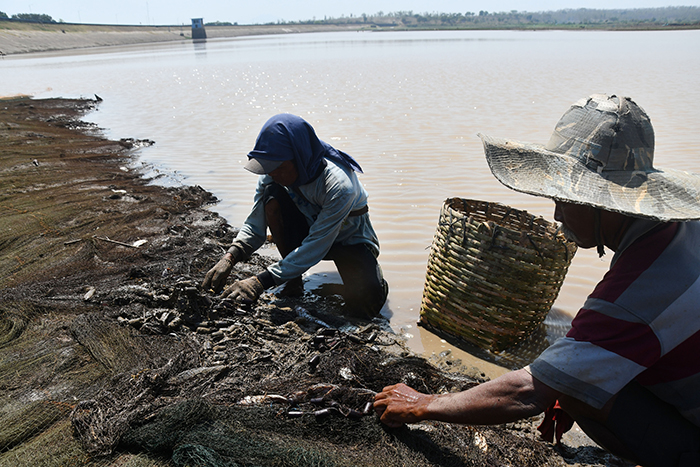 アチェ州アチェブサール県で14日、川の水を引くホースを準備する農家。100㌶以上の田んぼが干ばつの被害にあい、不作の恐れがある。(アンタラ) .....